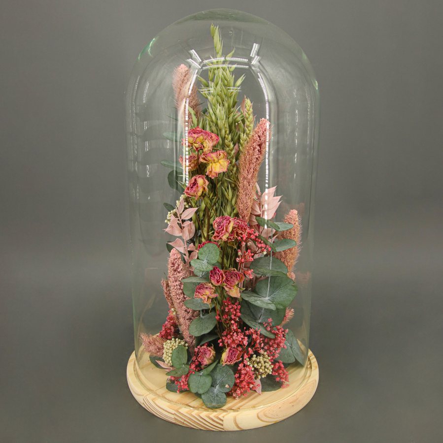 Cúpula de cristal con flores secas en tonos rosáceos. Medidas 40 cm de altura por 20 cm de diámetro